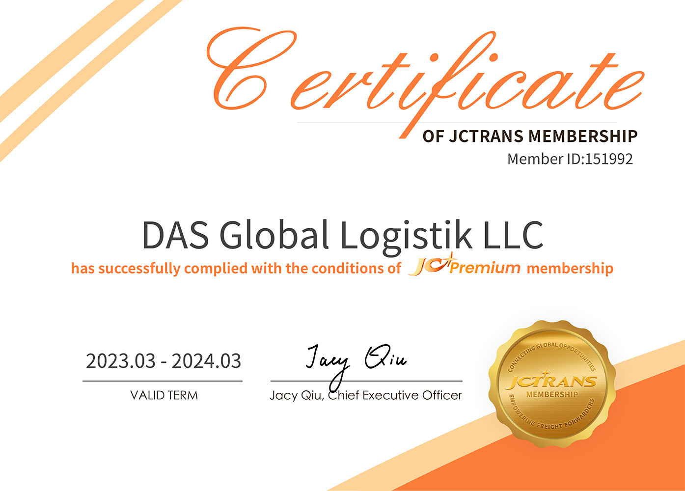 - Сертификат, подтверждающий членство в JCtrans по логистическим проектам на 2023-2024 гг. (Москва, Санкт-Петербург, Новороссийск, Екатеринбург, Владивосток)